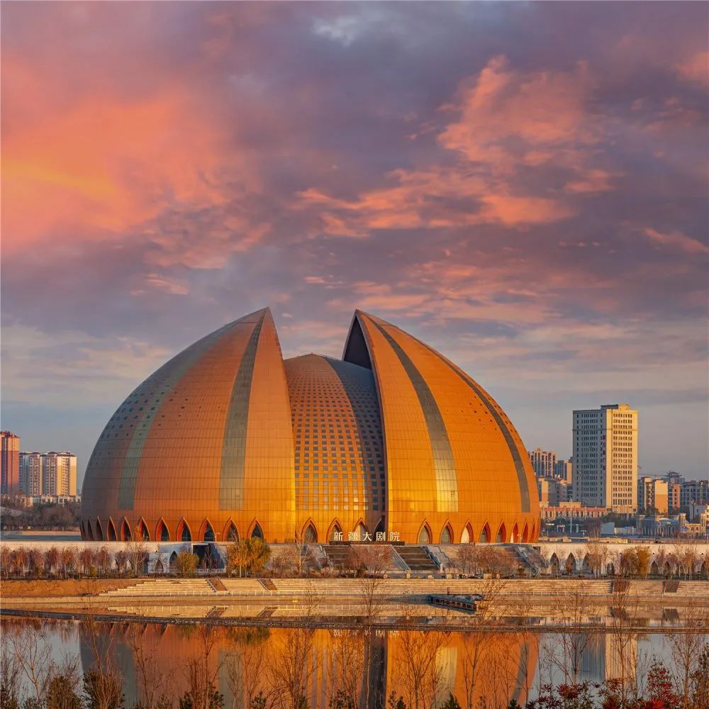 座落于昌吉的新疆大劇院,是中國目前最具民族文化特征的標志性建筑,也是印象西域國際文化旅游產(chǎn)業(yè)園的核心建筑。主體坐落在平緩的臺基上,以盛開的天山雪蓮為原型,通過抽象與創(chuàng)新的設(shè)計手法,形成里外套層的穹頂造型主體形象。